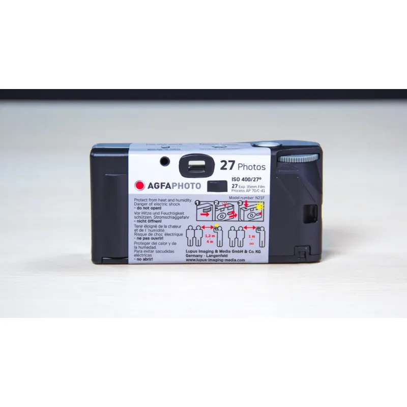 Disposable camera with flash Color film ISO 400 medium sensitivity 27 exposures Convenience of C41 processing