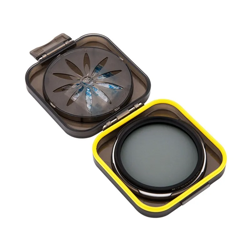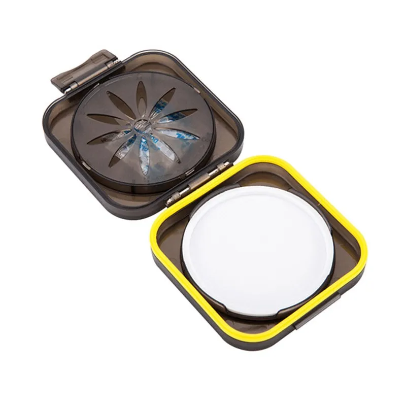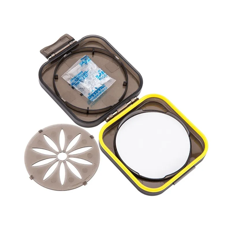 First, choose the right number of sponge pads, depending on the thickness of the filter, and place them in the bottom of the box. Then place the moisture-proof intermediate sheet. Then place the O-ring with the correct diameter of the filter in the box. For a 58 millimetre filter no O-ring is needed. If you want to place the filter more firmly in the box, you can add more sponge pads. Do not forget to place two bags of silica gel in the inner lid. The silica gel bags must be replaced every month to ensure that the filter remains free of moisture.