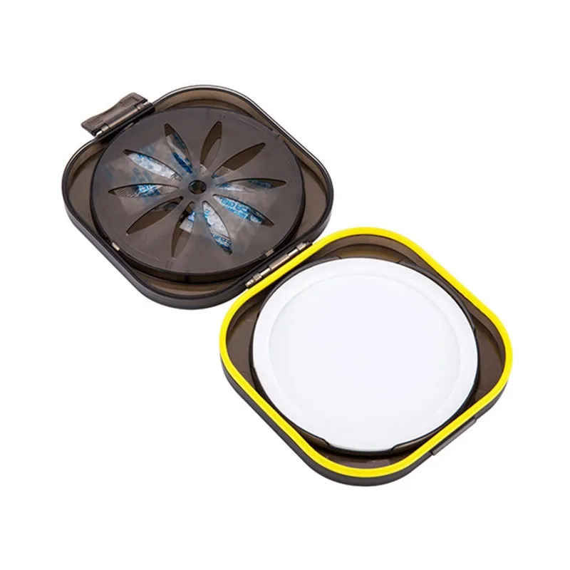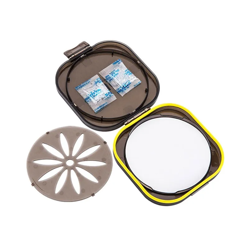 First, choose the right number of sponge pads, depending on the thickness of the filter, and place them in the bottom of the box. Then place the moisture-proof intermediate sheet. Then place the O-ring with the correct diameter of the filter in the box. For an 86mm filter, no O-ring is needed. If you want the filter to be more solid in the box, you can add more sponge pads. Do not forget to place two bags of silica gel in the inner lid. The silica gel bags must be replaced every month to ensure that the filter remains free of moisture.