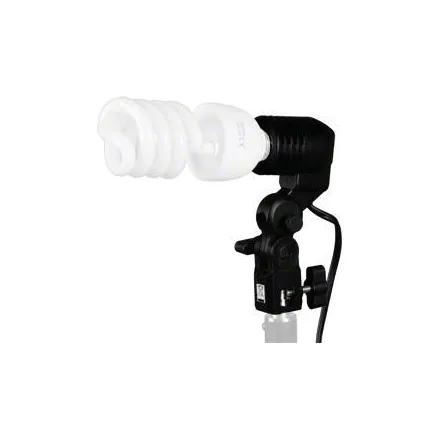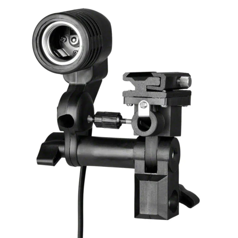 The umbrella holder for a sync flash is ideal for all sync flash lamps and spiral lamps with E27 socket up to max. 250W. It can be rotated by 360° and tilted by 180°, and is therefore extremely flexible. The on and off switch is located directly on the body. When you are working with a compact flash, the lamp holder is ideal for mounting a spiral lamp as a modeling lamp.