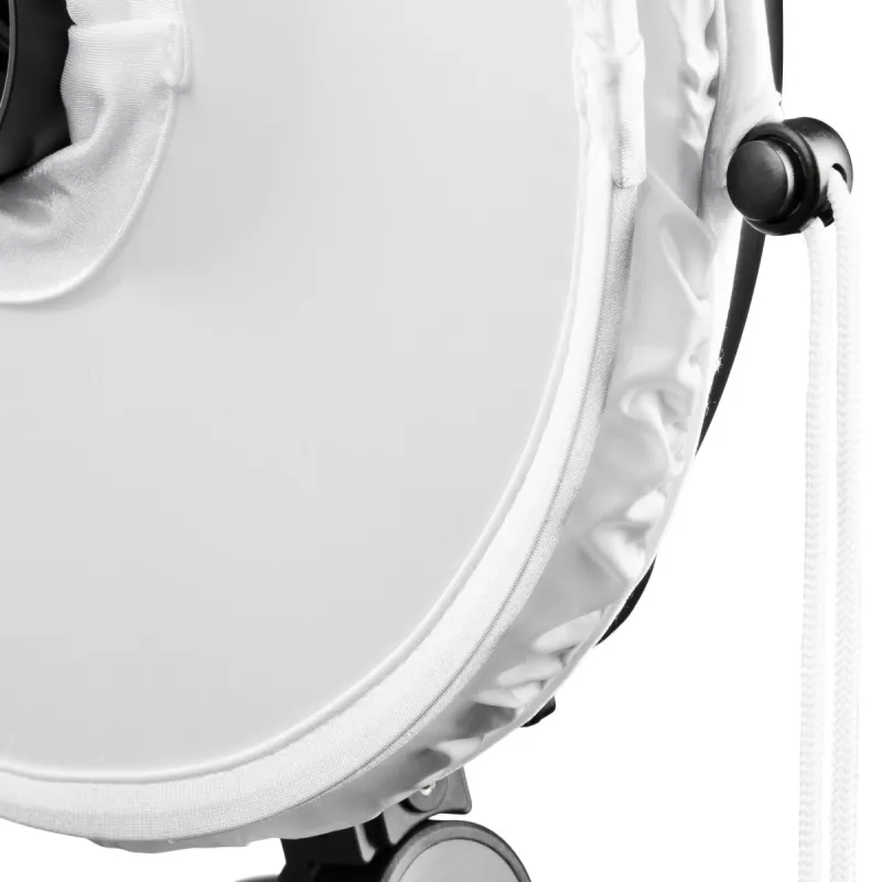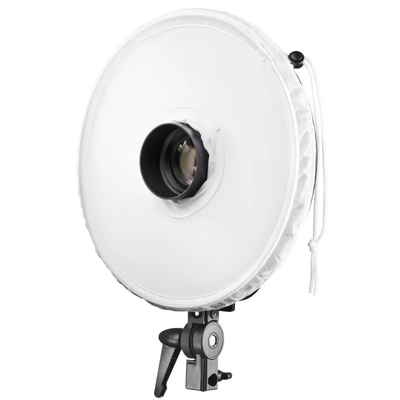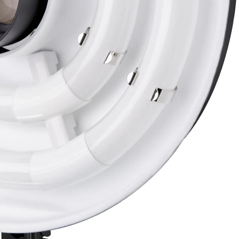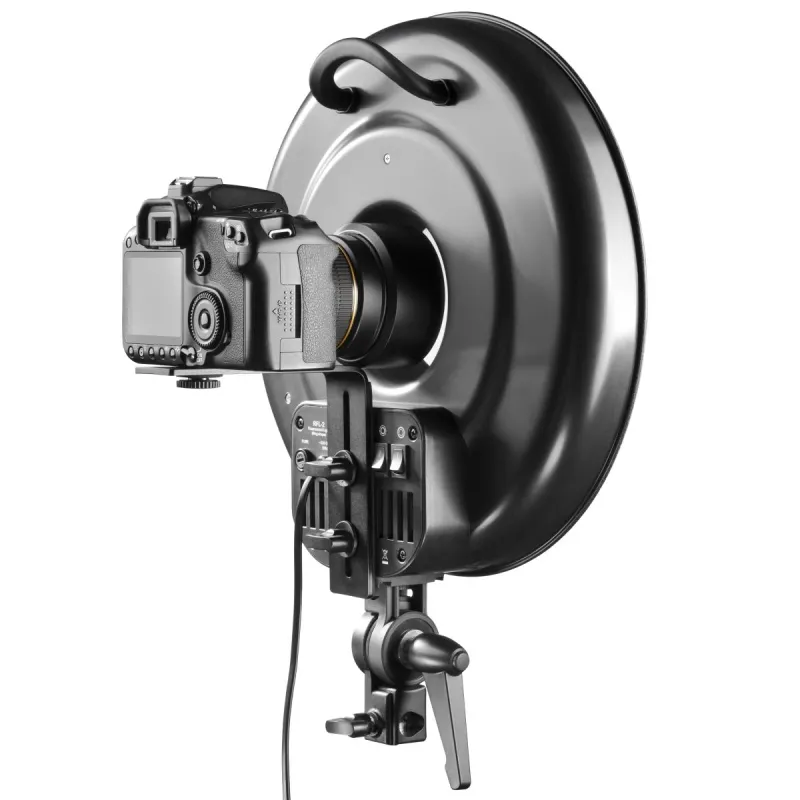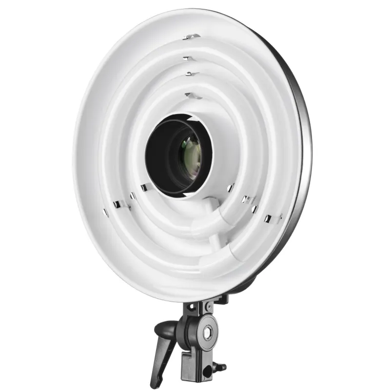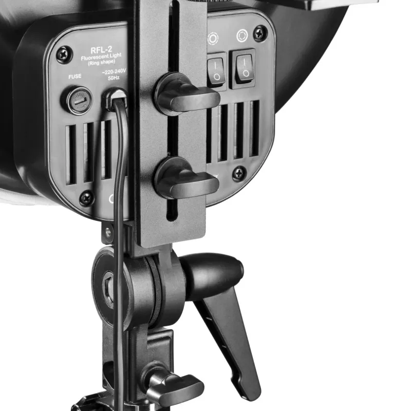 Thanks to the 10cm lens opening you can use your camera lens centered and directed. An l bracket supports you in positioning the light in the optical axis of your camera. Depending on the field of use, you can adjust the light output individually as the two tubes can be switched on and off separately. Additionally, a tilting device allows a flexible adjustment of the beauty light, which is ideal for use with, e.g., a shooting table.
