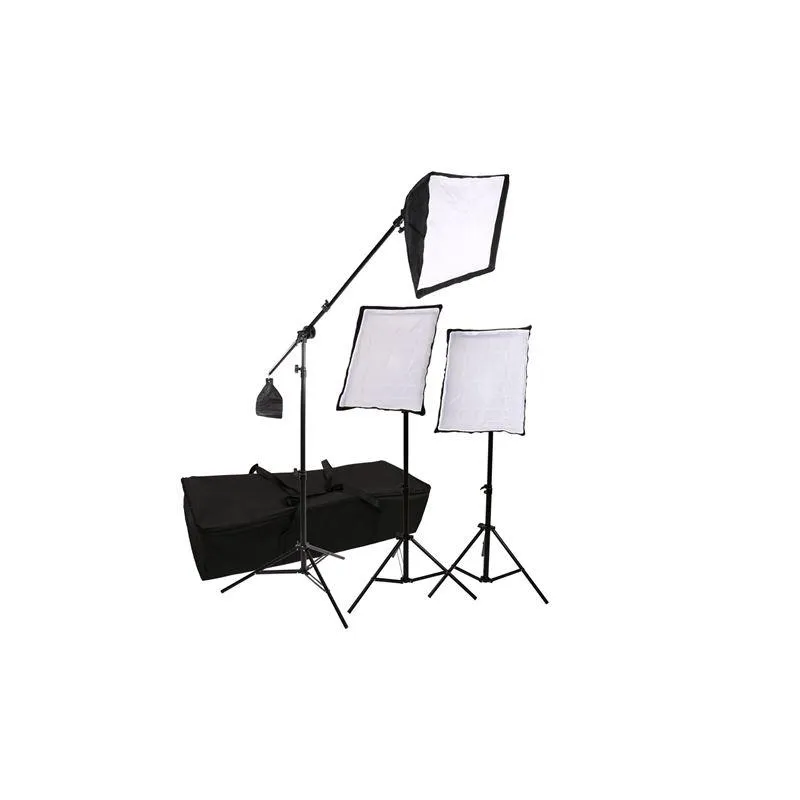 3x Lamp holder with softbox 50x70cm; 1x Light boom; 1x Sandbag; 3x Tripod; 3x Diffuse cloth; 3x Honeycomb; 3x Spiral lamp 135W; 1x Bag