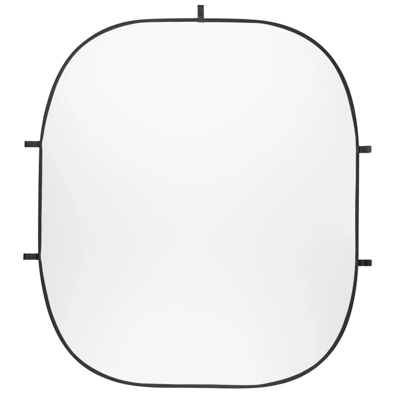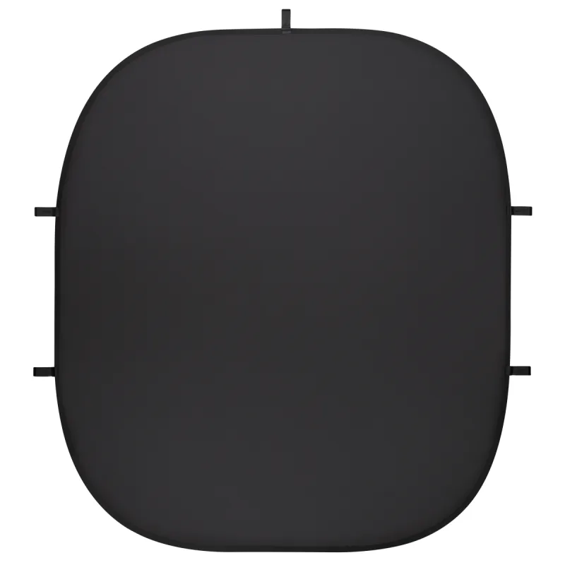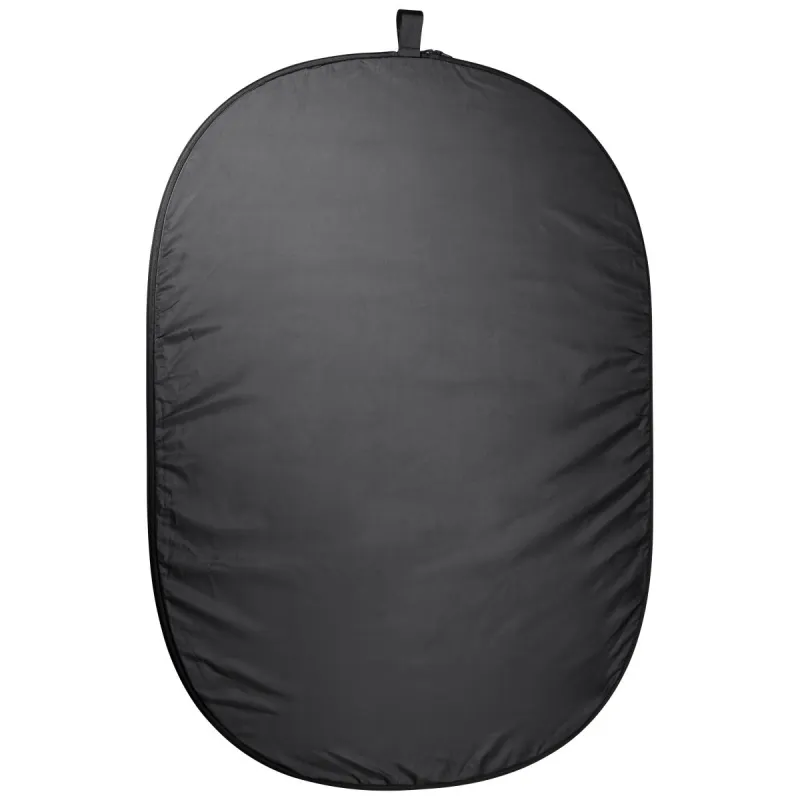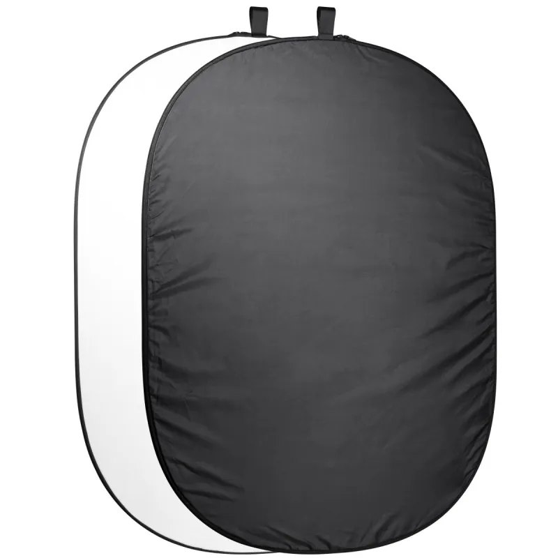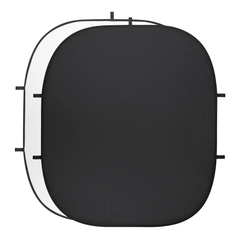 Double-sided folding background 150 x 200 cm black and white Black for flagging, white for easy cropping Self-tensioning, sturdy frame with loops for fastening PE fabric, particularly crease-resistant Transport size: Ø approx. 65cm With 2 carabiners for hanging and practical transport bag