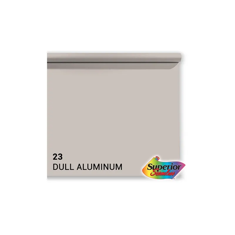 This roll of Superior Specialties backdrop paper is a 2.72 x 11m roll in the color 23 Dull Aluminum, or gray. With this roll of professional quality paper you can create a smooth, even background.