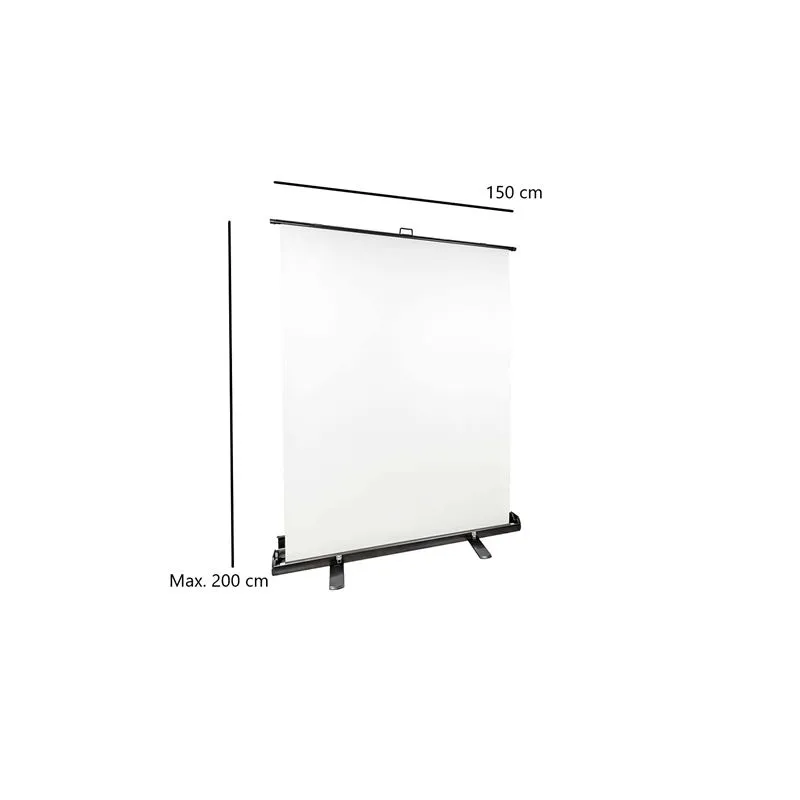 When you unfold the background screen completely, the height is 200 cm; the width is 150 cm. When you fold the whole, you can carry it with you like a suitcase using the handle. This roll-up background screen is also available in other colors (see optional accessories).