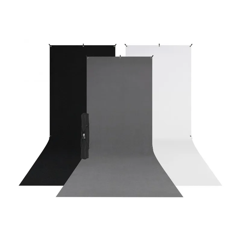 This unique all-in-one backdrop system with telescopic arms and legs is quick to set up and easy to store. The kit comes with three matching backdrop cloths in white, black and grey. The backdrops have eyelets on the top and bottom for easy hanging and a tight fit.
