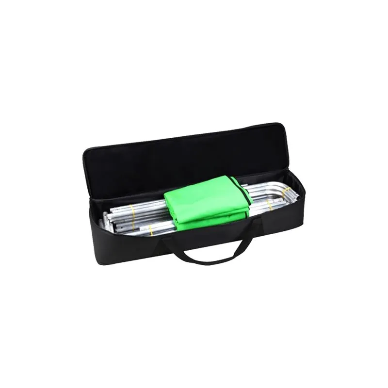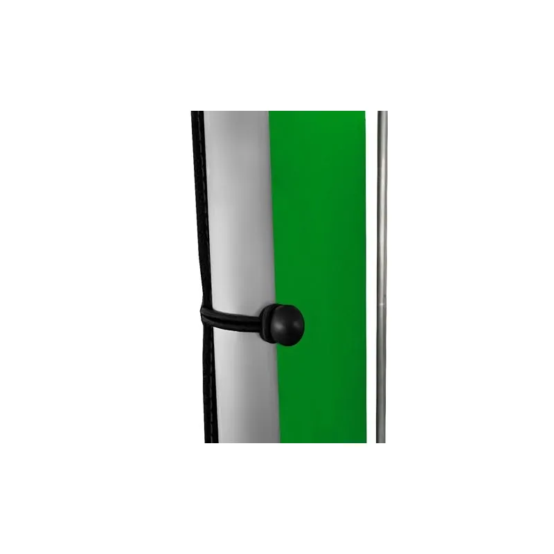 You take the FSF-240400PT to any location in the compact bag with handles. The aluminum construction, complete with bag and canvas, weighs only 8 kg. The overall dimensions of the FSF-240400PT are 2.4 meters high and 4 meters wide. Horizontally, the FSF-240400PT consists of four separate sections, which are joined together by the supplied couplers. The four sections can be mounted securely with click connections. With the FSF-240400PT you receive a large green cloth, made of a smooth, strong fabric (polyester, 120g/m²). The cloth can be hand washed and ironed at a low temperature. When you attach the cloth to the metal construction of the FSF-240400PT with the black rubber bands and matching beads, it creates one large green background. Within a few minutes you will have assembled the cloth. The second cloth included in the delivery is used as a background. This cloth is attached to the background with Velcro, so that it stays nicely in place.