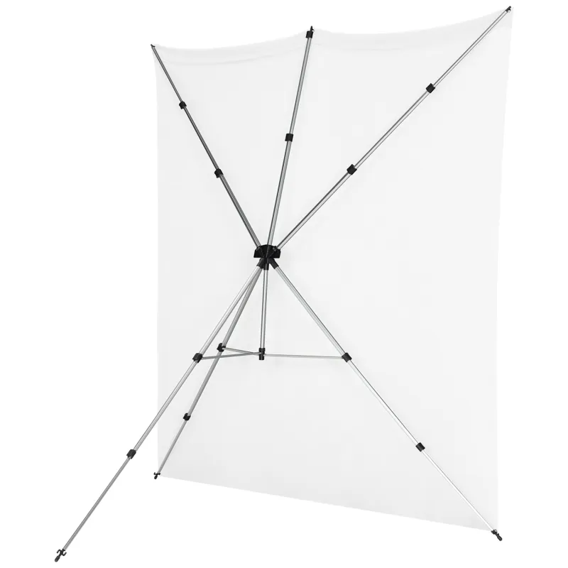 This X-Drop Pro portable backdrop kit offers flexibility on every level. The patent-pending stand features a heavy-duty frame that's convertible to support 8' X-Drop Pro and 5' X-Drop backgrounds. It can be assembled by one person in minutes, is adjustable for tight spaces, and collapses to fit in the trunk of your car. Perfect for traveling photographers, studios, video, photo booths, interviews, school photographers, and more.