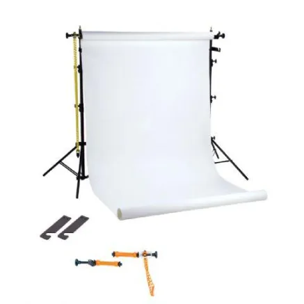2 x (light)stand I-2601M;3 x rolling system B-reel (6 holders, 3 chain (1.7 m), 3 x chain guides) ;1 x roll 1.38x11 m backdrop paper white ;1 x roll 1.38x11 m backdrop paper black ;1 x roll 1.38x11 m backdrop paper sky blue
