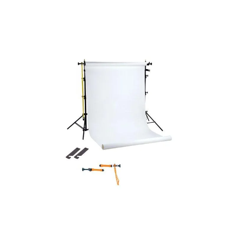 2 x (Light)stand I-2601/M; 1 x rolling system B-Reel (2 holders, 1 chain (1.7 m), 1 x chain guides) ; 1 x Roll 1.38x11 m backdrop paper white