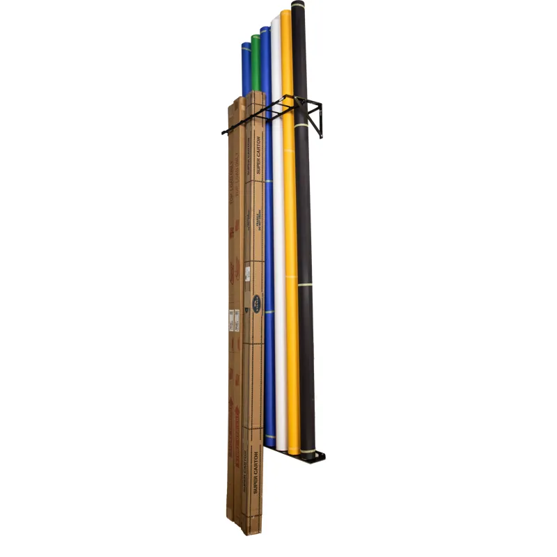 A complete storage set for 12 backdrops is a composite assembly consisting of 2 storage racks, 1 bottom frame, and 2 triangle support feet. This combo set ensures the overall strength and balance of the rack, providing durability and stability in the storage system. Follow the assembly instructions to organize a safe storage solution for backdrops in your workspace.