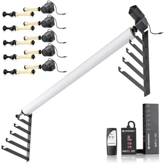 Space-saving electronic photo background system for six background rolls with practical remote control