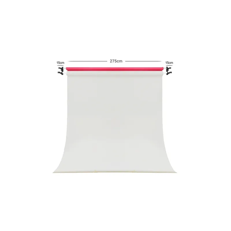 From the ceiling, the full height of the background system is 40 cm. The rollers (their center) have the following distances seen from the ceiling: 11cm, 14cm, 18cm and 21cm. The maximum depth is 40cm. The total outside dimension including the longest roll of 2.72 meters is 2.93 meters. The maximum loadable weight per roll holder is 10kg.