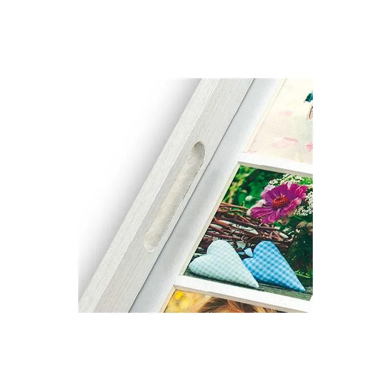 The W006 from Zep Italia is a wooden photo tray suitable for four photos of 10x10 cm and five photos of 10x15 cm. The photo frame features a white frame. The total dimensions, including the frame, are 45x35 cm.