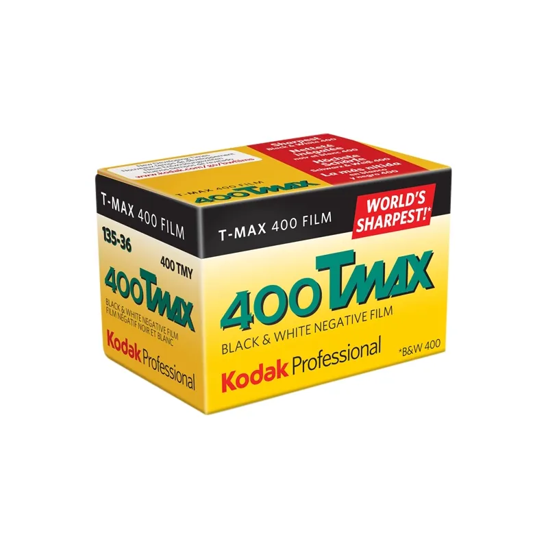Kodak's Professional T-Max 400 is a high-speed panchromatic black and white negative film featuring a unique T-GRAIN emulsion to provide a very fine grain structure with a high degree of sharpness and edge detail. It has a nominal sensitivity of ISO 400/27° along with a wide exposure latitude for rating the film up to EI 1600 and push developing. Its versatility benefits working in difficult lighting conditions and with moving subjects, and its fine grain profile, broad tonal range, and high resolving power benefit scanning and enlarging applications. Additionally, the film is well-suited to scientific and biomedical work, especially when fluorescence in photography is required.