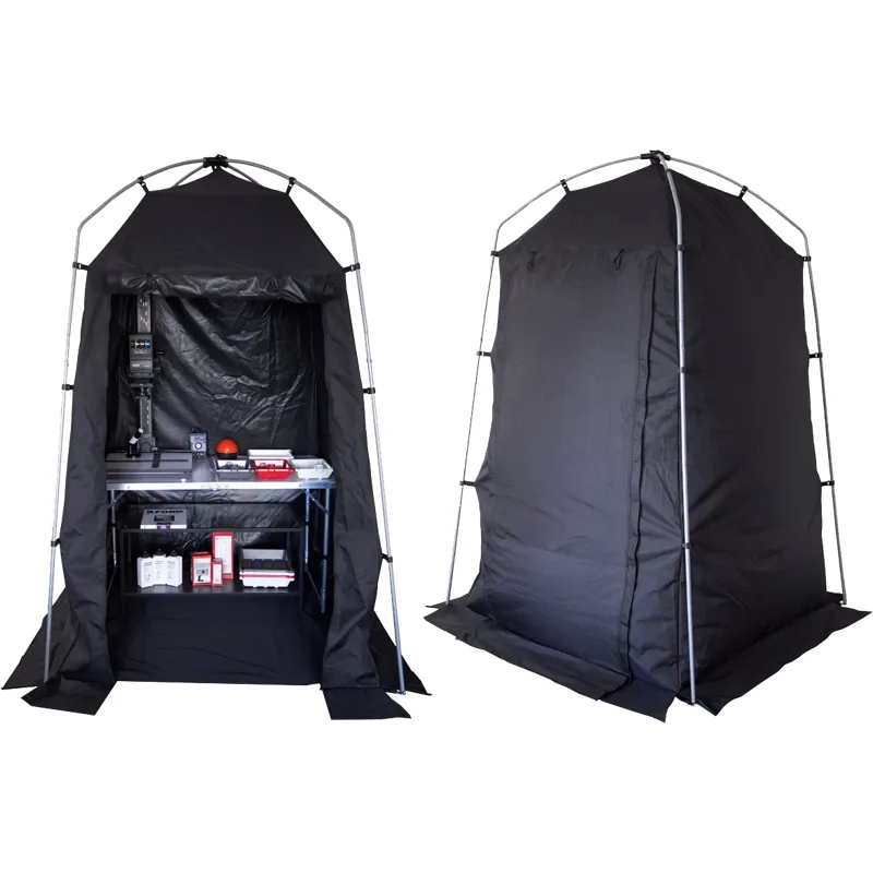 A built-in air vent towards the base of the darkroom allows for an optional fan / air blower to be used and once sealed the incoming air will also expand the inner dimensions. A smaller vent is also included closer to the top of the darkroom to attach air extraction tubes (not included).