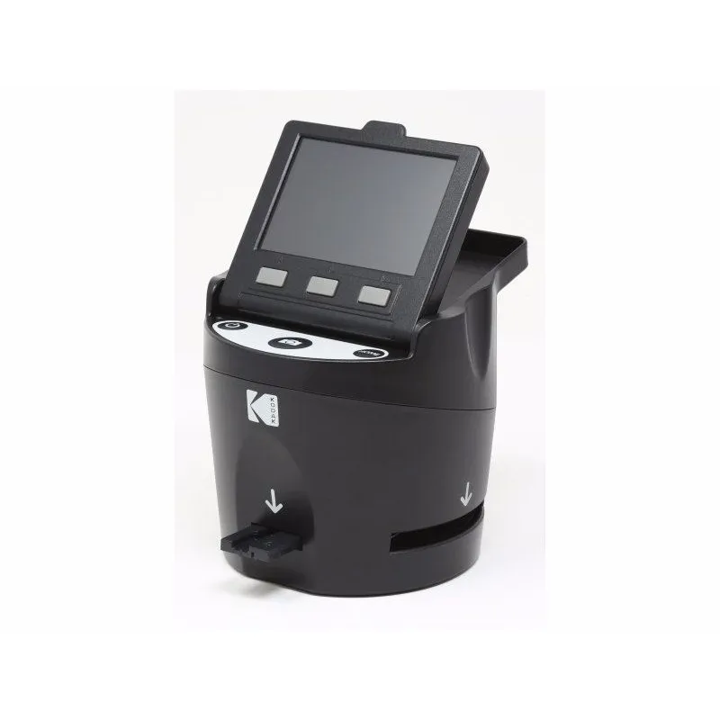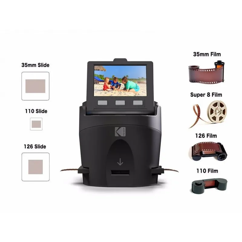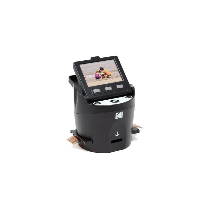 With the Digital Film Scanner from KODAK, reliving the past is as simple as scan, save and share. This versatile film-to-JPEG converter digitizes and optimizes a variety of films including 35mm, 126, 110, Super 8 and 8mm negatives, enabling you to transfer images to any Mac or PC device for saving, sharing, printing and editing. Our all-in-one package comes ready with everything you need to start scanning: various film adapters and inserts, a built-in LCD color display, an exceptionally easy operational interface as well as multiple cables for device hookup. Don't settle for less than superior image quality. Trust the giant of digital innovation.