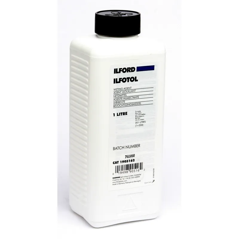Product type (b&w/color): b&w Package: Single package Type: Liquid concentrate Liquid concentrate in ml / l: 1L Ilford Ilfotol is a non-ionic wetting agent for processing films and fiber-based papers. Ilfotol aids rapid even drying and so greatly reduces the risk of drying marks (limescale) being formed. Ilfotol can be used in all manual and machine processes. Dilution (depending on water hardness): 1 + 200 to 1 + 500