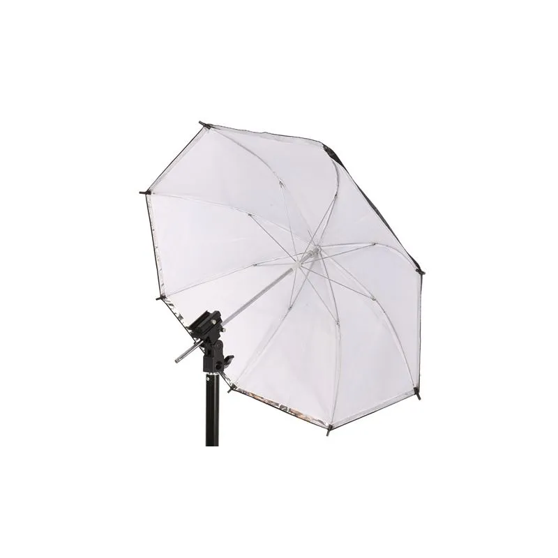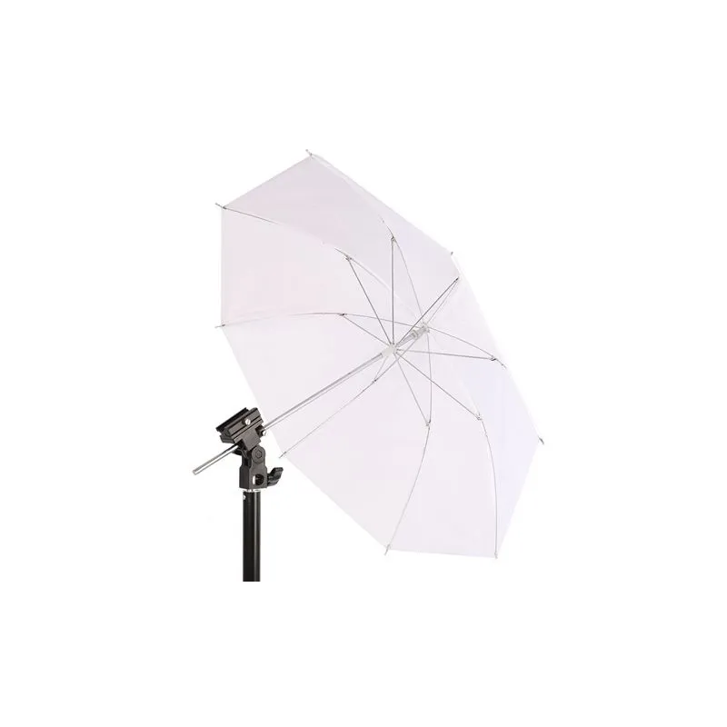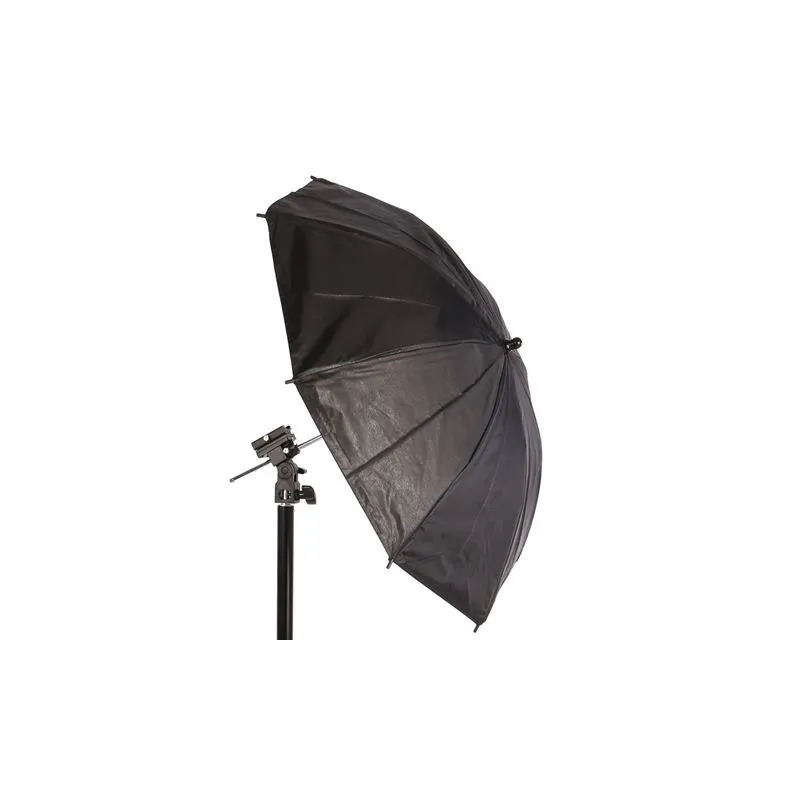 Four accessories are included in this set, including a flash umbrella. It has a diameter of 64 cm. The umbrella has both a black and a transparent (diffuse-white) side. The black umbrella allows you to reflect the flash light, while the transparent, diffuse-white side allows you to flash through, so the light is more diffused. You place your camera flash on the hot shoe and attach the umbrella in the tilting bracket. With the tilting mechanism you can set it to the right angle.