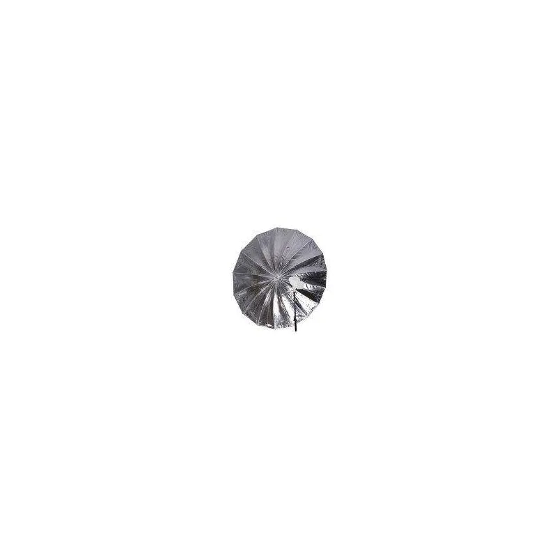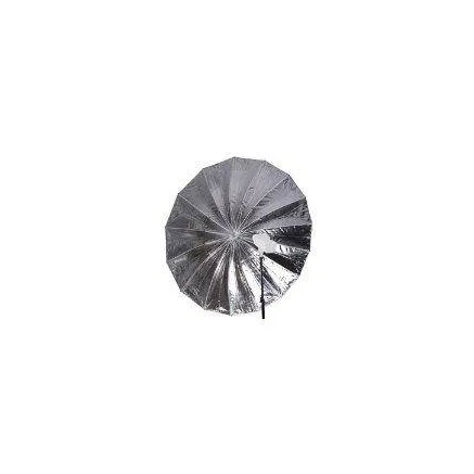 This Falcon Eyes flash umbrella has a silver interior coating and a white exterior fabric. An umbrella with a silver coating inside reflects fairly hard light.