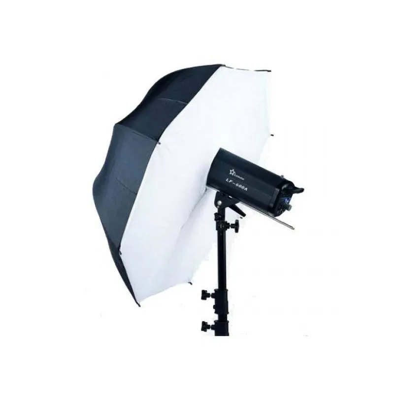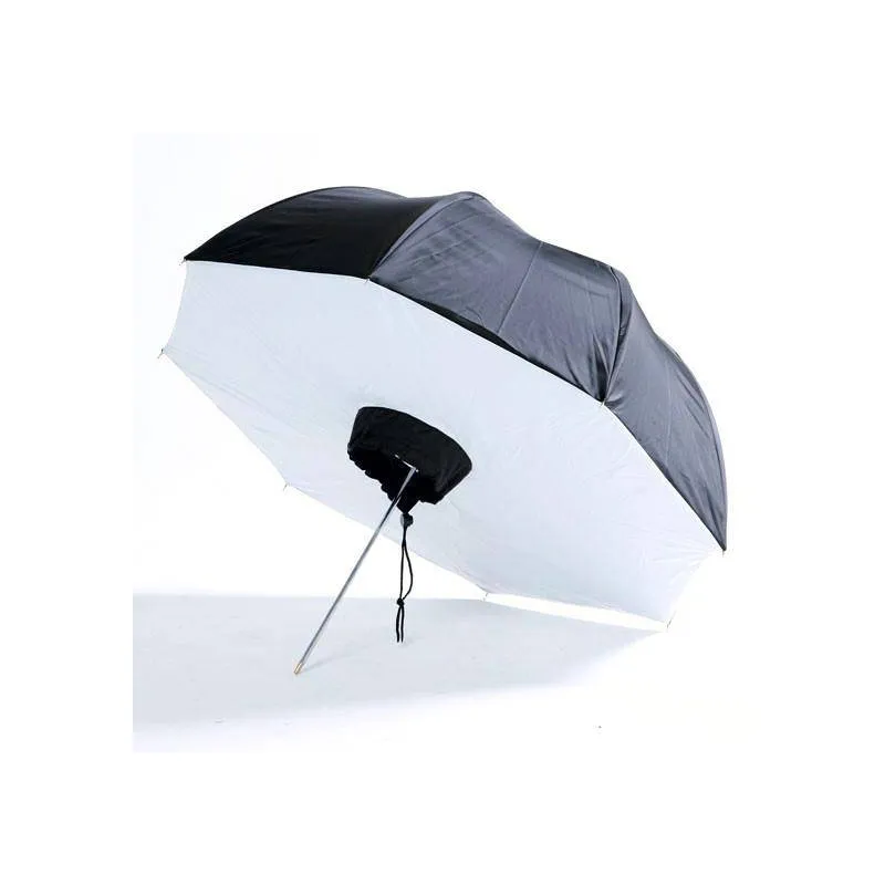 A softbox umbrella (brolley) can easily be brought along on location and is the low-priced alternative for a softbox. A softbox is more difficult to bring along on location and damages more easily. A softbox umbrella however is quickly unfoldable, less vulnerable and fits on almost any flash unit. This softbox umbrella is mounted in the umbrella mount of the flash unit and has a black outside and diffuse white (transparent) inside. Suitable for indirect/reflecting light.