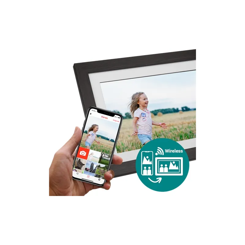 Frameo's HF-101WB is a brown and white digital picture frame with a 10.1-inch IPS screen. The special feature of the Frameo is that you can use a smartphone app to wirelessly upload photos to the Frameo. Place the Frameo centrally in your living room and enjoy the most beautiful photos taken by you and your family. Operation is very easy, due to the touch-sensitive screen and the Android operating system. The HD resolution of 1280 by 800 pixels ensures sharp and vivid pictures. The dimensions of the screen are 21.5x13.3 cm. Including border, the Frameo measures 26x18 cm. The Frameo is 2.3 cm thick. A wide viewing angle makes it possible to view photos from the entire living room. On the Frameo's internal memory you can place more than 1000 photos. It is also possible to import photos or make a backup with a micro SD card or USB stick. You can place the Frameo both horizontally and vertically on a table with the leg.