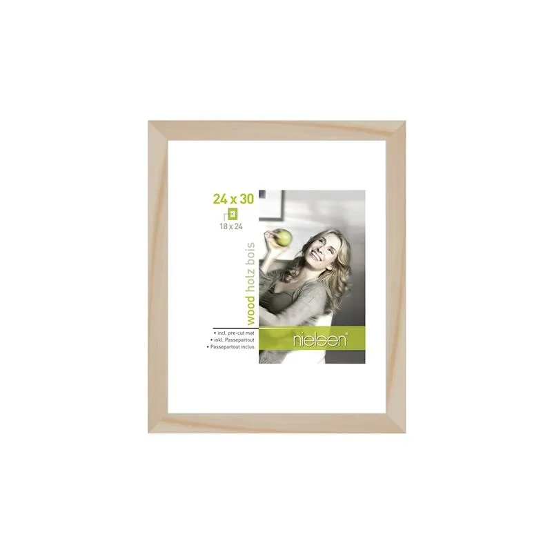 The 8988008 Apollon from Nielsen is a lightyellow (naturel) picture frame suitable for one picture. You can insert a picture of 30x40 cm in this frame. A passe-partout is also supplied for 18x24 cm pictures. The picture frame is characterized by its wooden look. The total dimensions, including the frame, are 28x34 cm.