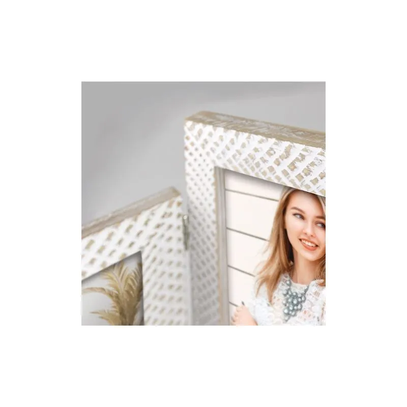 The NC989 from Zep Italia is a photo frame which is suitable for two photos of 10x15 cm. The photo frame features a white vintage wooden frame. The total dimensions, including the frame, are 33x19 cm. The photo frame is suitable for horizontal placement. You can place it on a table.