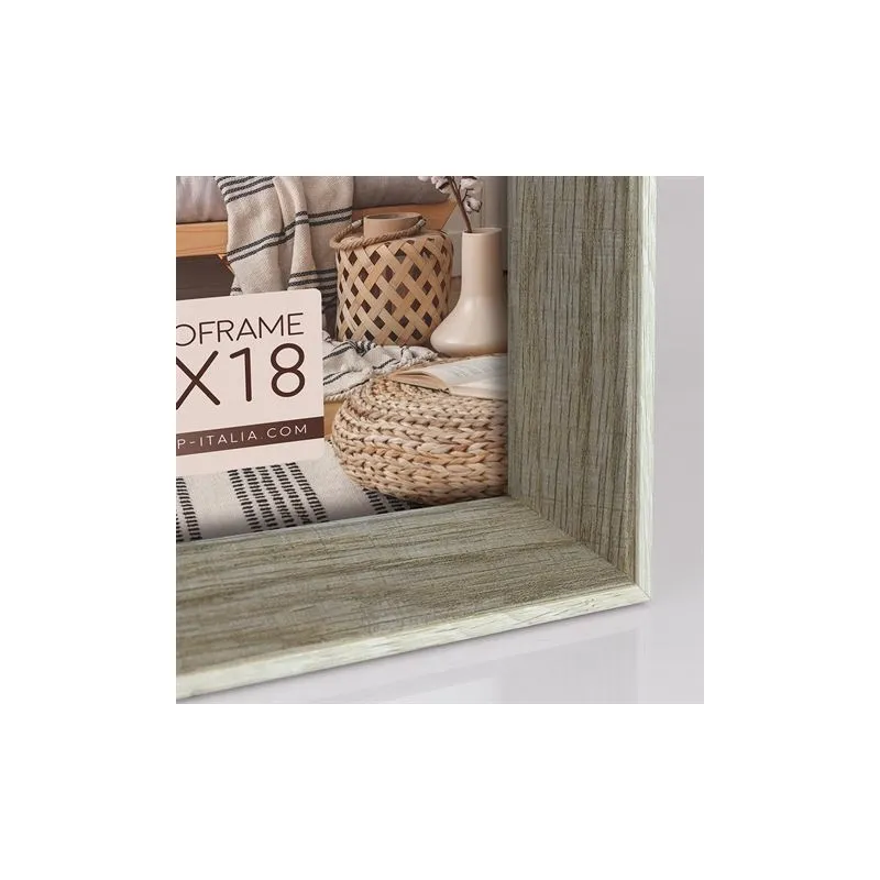 The PZG46 Scott Grey 10x15 cm by Zep Italia is a single photo frame suitable for one 10x15 cm photo. The article stands out by its diagonal inward frame, which gives the photo frame an almost painting-like appearance. The outer frame is light grey; the inner frame has a grey/brown wood motif. The total dimensions, including the frame, are 12x17 cm. The frame is made of MDF.