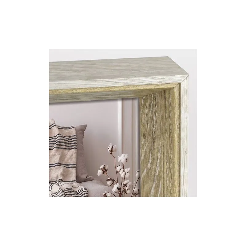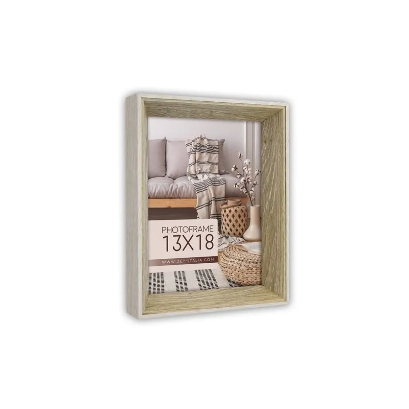 The PZC57 Scott Cream 13x18 cm by Zep Italia is a single photo frame suitable for one 13x18 cm photo. The article stands out by its diagonal inward frame, which gives the photo frame an almost painting-like appearance. The outer frame is light grey; the inner frame has a cream-colored wood motif. The total dimensions, including the frame, are 15x20 cm. The frame is made of MDF.