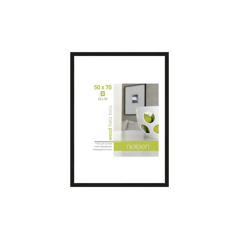 The 8988031 Apollon from Nielsen is a black picture frame suitable for one picture. You can insert a picture of 50x70 cm in this frame. A passe-partout is also supplied for 40x50 cm pictures. The picture frame is characterized by its wooden look. The total dimensions, including the frame, are 54x74 cm.