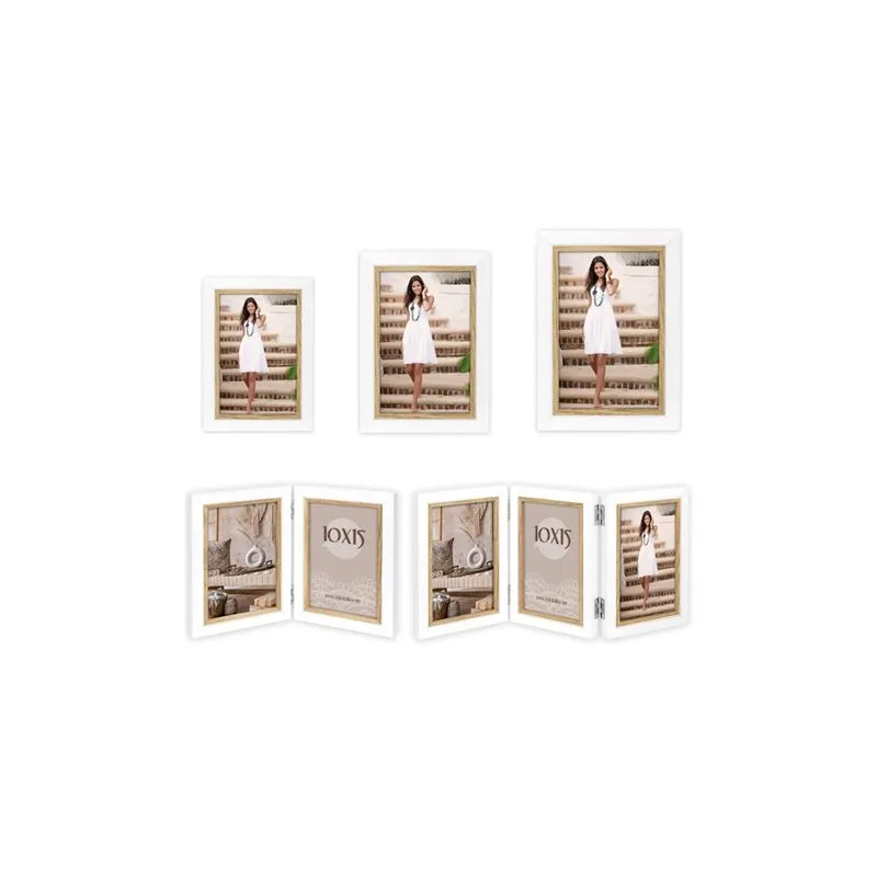 The AYAS Action Package from Zep Italia is a unique composition of sleek white wooden picture frames with a typical wood color (light brown) inner edge.