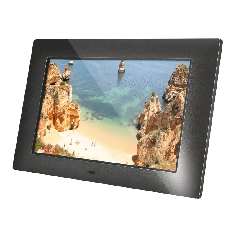 The Braun 720 picture frame is a computer-independent digital picture frame with an elegant black design, with energy-saving LED backlighting and a video function. The digital picture frame with a 7-inch TFT LCD screen displays a slide show of photos at an adjustable interval, and the frame has a thumbnail mode that shows several pictures at once. The picture frame has an integrated memory card reader and USB 2.0 connection.