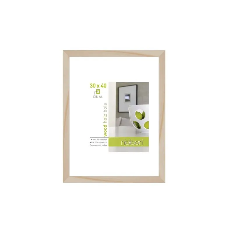 The 8988018 Apollon from Nielsen is a lightyellow (naturel) picture frame suitable for one picture. You can insert a picture of 30x40 cm in this frame. A passe-partout is also supplied for 21x29,7 cm pictures. The picture frame is characterized by its wooden look. The total dimensions, including the frame, are 34x44 cm.