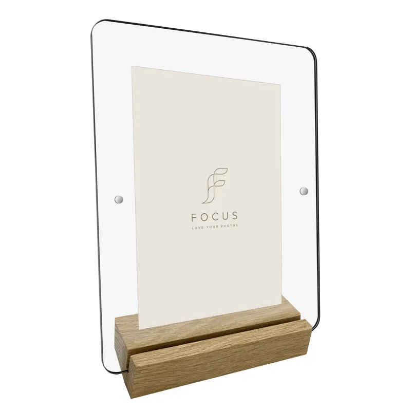 Easily place your favorite photo or art print between acrylic panels and insert it into a wooden base - no tools or assembly required. The groove in the solid wood block securely holds the acrylic, providing a stable display without damaging the print.