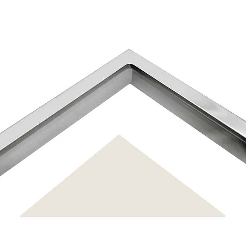 This floating frame features a silver metal border that adds sophistication. The polished metal finish of this modern mirror makes the frame suitable for both light, airy interiors and more elegant, monochromatic arrangements.