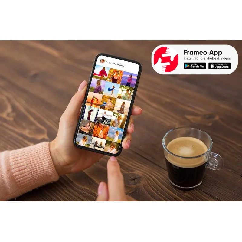The FRAMEO app, which is compatible with both iOS and Android, makes it possible for the online APF1000WIFI photo frame camera to receive photos and videos sent from a smartphone anywhere in the world. Material sent can even be accompanied with a message. Its use is accessible to all; while the device is switched on, you will automatically see new photos and videos appear in the slideshow. All you need is an internet connection. Its simple, free, and completely safe. The camera also has built-in clock and weather functions which make it a highly practical everyday object.
