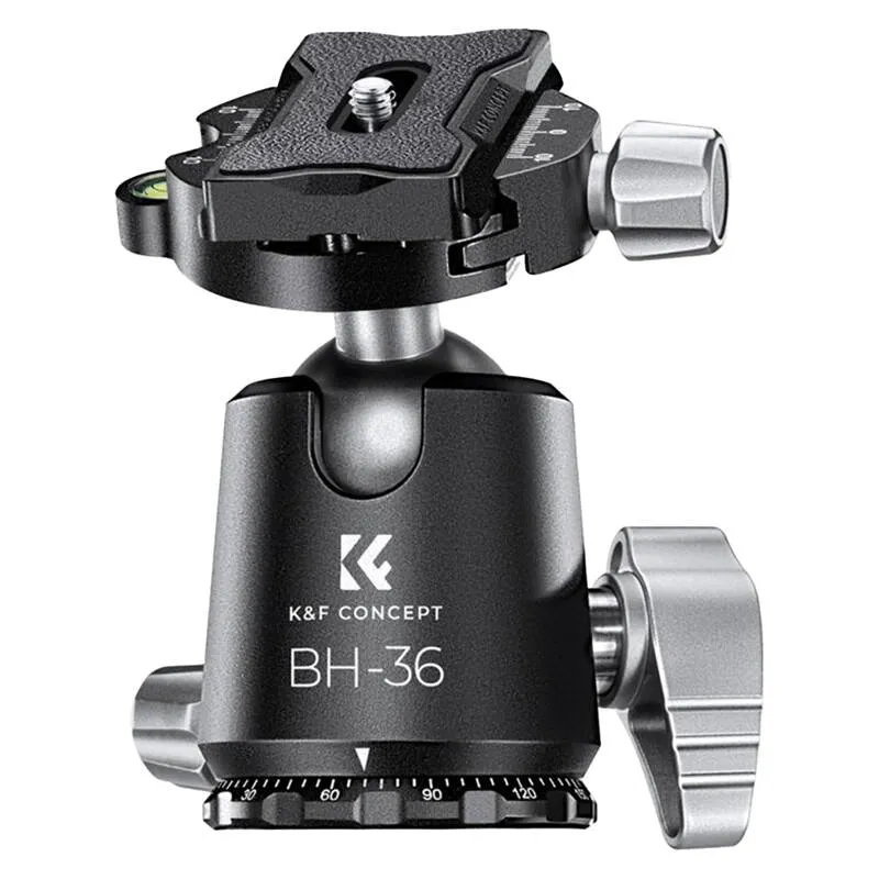 The ball head, made from high-quality aluminum alloy, includes a 360-degree panning knob for smooth panoramic shots. Its dimensions are 36 mm in diameter and 102 mm in height, providing stable camera support and resistance to wear and rust.