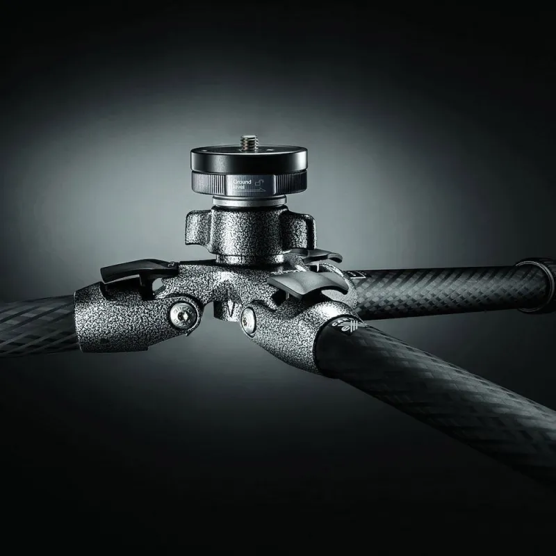 The center column on the tripod can be removed for Ground Level Set, which enables the tripod to reach its lowest height of 15 cm. Its four-section legs are secured with twist locks that incorporate G-lock Ultra, which has an internal O-ring to prevent dust and particles from entering the leg system. The top spider has been redesigned to add rigidity, and large leg angle selectors give you more area to grip when readjusting leg angles. A ballast hook on the center column allows you to add weight to increase the tripod's stability.
