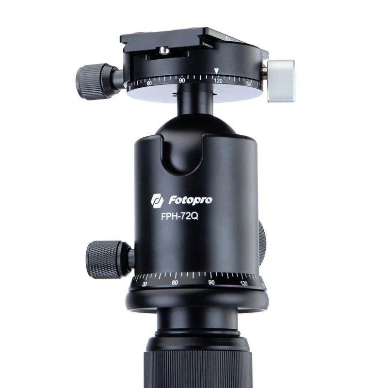 The Fotopro X-75C tripod is equipped with the FPH-72Q ball head with Arca Swiss standard quick-mount plate. It offers 2 levelers, making it easy to position the camera in the optimum position. The FPH-72Q head has two precise and smoothly operating knobs. One is used to lock and adjust the clamping force of the ball, while the other locks the movement of the rotating head base. There is also a 360º graduation scale, which will help take care of proper precision when shooting panoramic images.