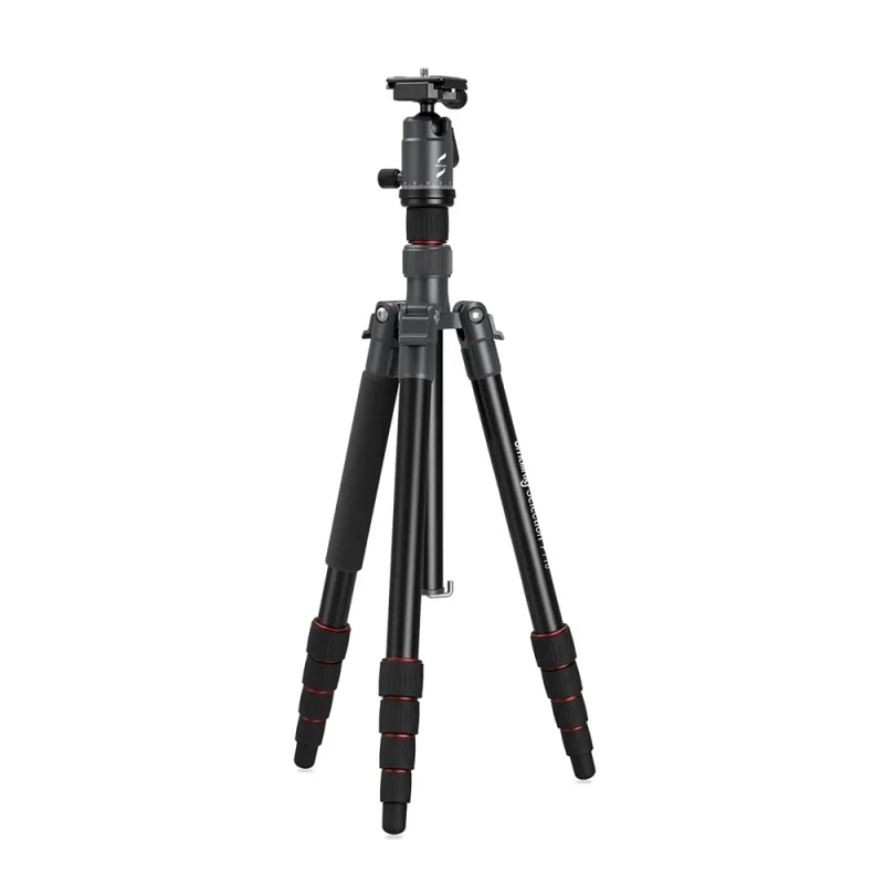 SmallRig Selection Portable aluminum camera tripod PT10 3257 is made of aluminum alloy, with a safety payload of 8kg. The tripod supports DSLRs, mirrorless cameras, etc. Its five-section legs secured by twist locks enable a maximum working height of 1445mm and excellent stability. It features reverse folding to realize a folded length of only 325mm, making it easy to carry around. Its two-section invertible center column enables you to make low-angle and macro shots. A detachable monopod brings great flexibility. The tripod comes with a ball head that supports panoramic shooting and an Arca-Swiss-type quick release plate for a quick switch between handheld and tripod shots.