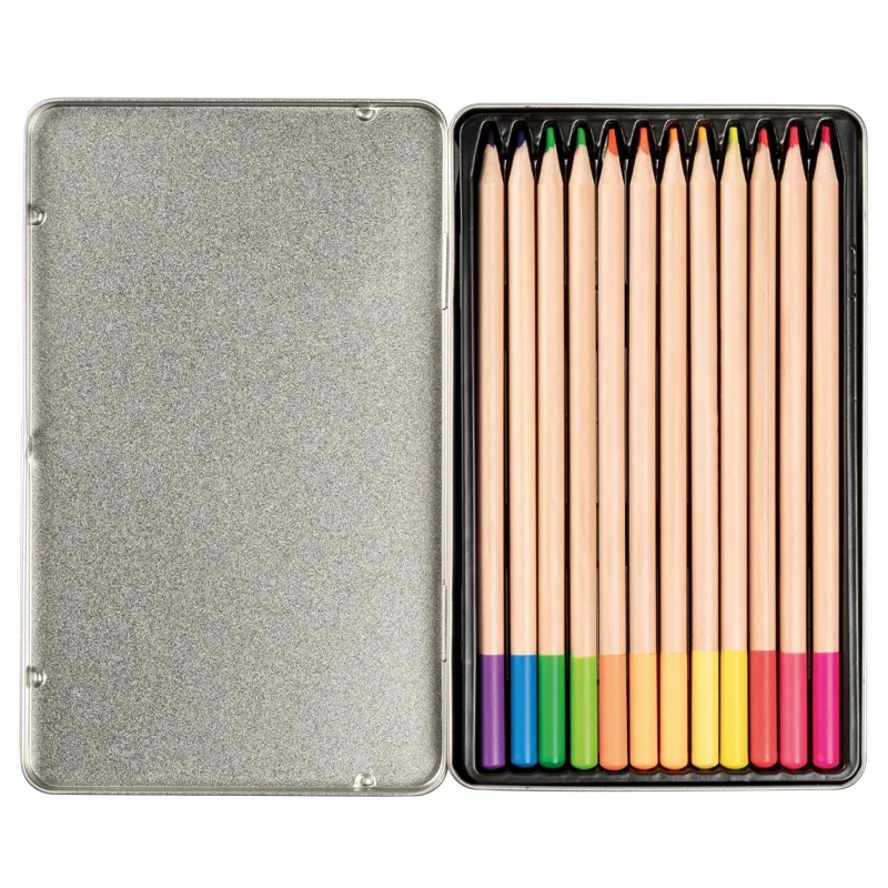 Wooden crayons in a metal box. 12 pieces break-proof wooden crayons in the classic hexagonal format for limitless creativity. Intense colors, suitable for light, colored or dark papers. 12 pens in different colors, packed in a practical metal box, in glossy neon Packaging: 12 pieces in a metal box