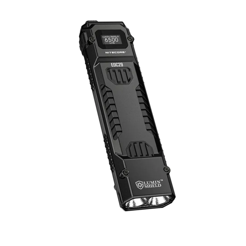With a robust, armored body made of carbon fiber and stainless steel, the EDC29 offers a secure grip and resists pressure and bending. Despite its sturdy design, the torch weighs only 160g. The built-in 2,500mAh battery offers up to 61 hours of usage time, and the OLED display shows real-time information such as brightness and battery status. With IP54 water resistance and drop resistance to 1 meter, the EDC29 is reliable in a variety of environments.
