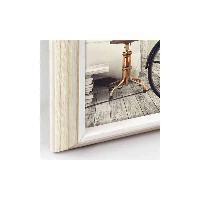 The RL23N Corby by Zep Italia is a single wooden photo frame suitable for one 20 x 30 cm photo. The overall dimensions, including the frame, are 21.5 x 31.5 cm. The photo frame is characterized by its rustic wood and white accent frame.
