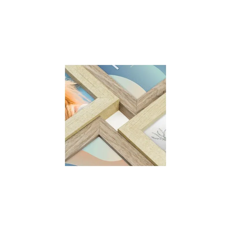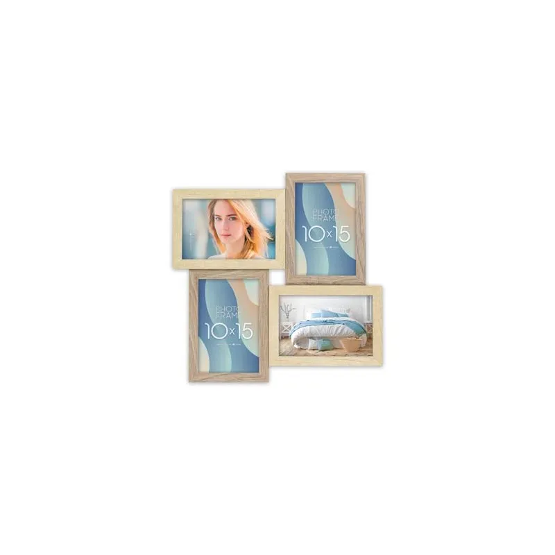 The Zep Photo Frame DT987 Oberg 4Q 4x10x15 cm is a photo collage suitable for 4 photos. You can place 4 photos of 10x15 cm in this frame. Oberg wooden frame, brown and natural wood color, wall-mounted multiple photo frame, composed by horizontal and vertical overlapped frames on different levels, for 4 photos, suitable for home and office. The overall dimensions, including the frame, are 32 x 32 cm (lxw).