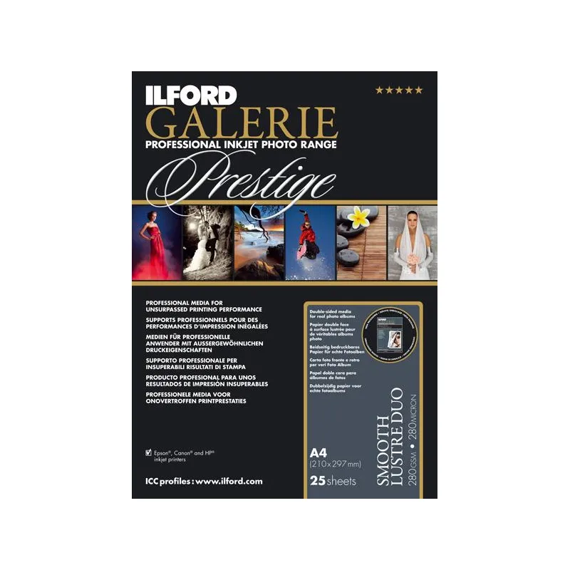 GALERIE Prestige Semigloss Duo is a true double-sided resin coated media with a professional semigloss finish. The paper has a natural photographic white tint to produce prints with superb colour gamut, perfect for skin tones.