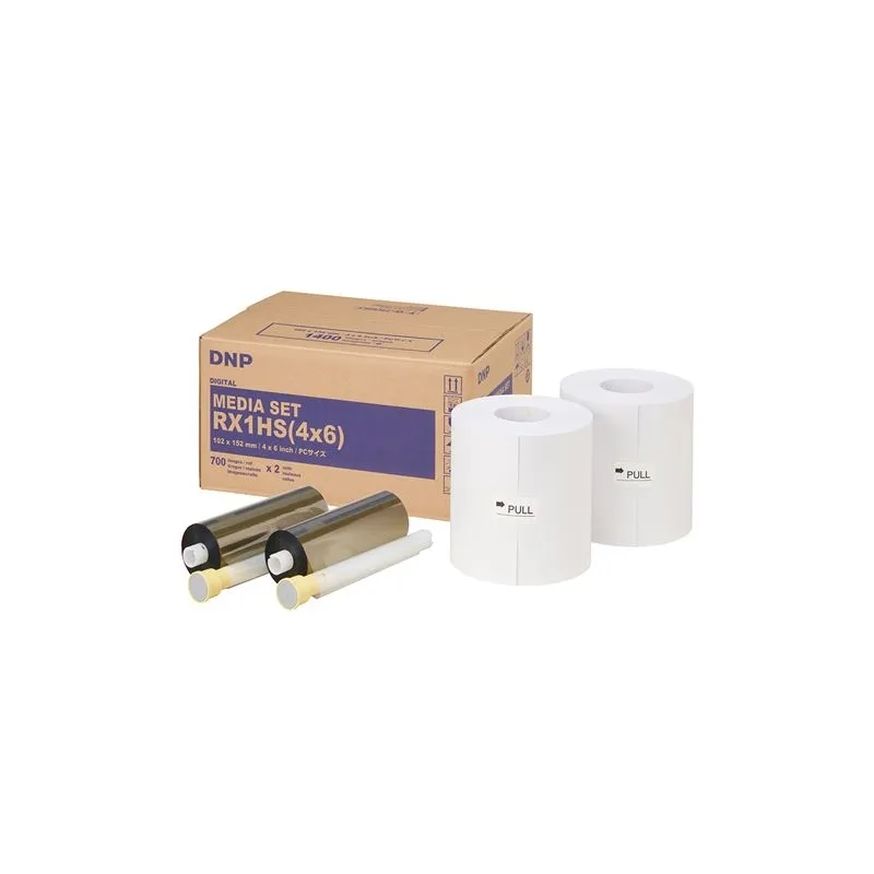 This paper allows you to make 10x15 cm (or 4x6 Inch) prints. The DSRX1HS-4X6 paper is suitable for both the DS-RX1 and the new DS-RX1HS printer. With this article you will receive two rolls, each suitable for 700 prints. This means that you can make 1400 prints in total. You will also receive two ink ribbons, also known as colored film. This "standard" paper has a DNP backprint on the back. This means that on the back side, the DNP brand is displayed a few times as a watermark (see images).