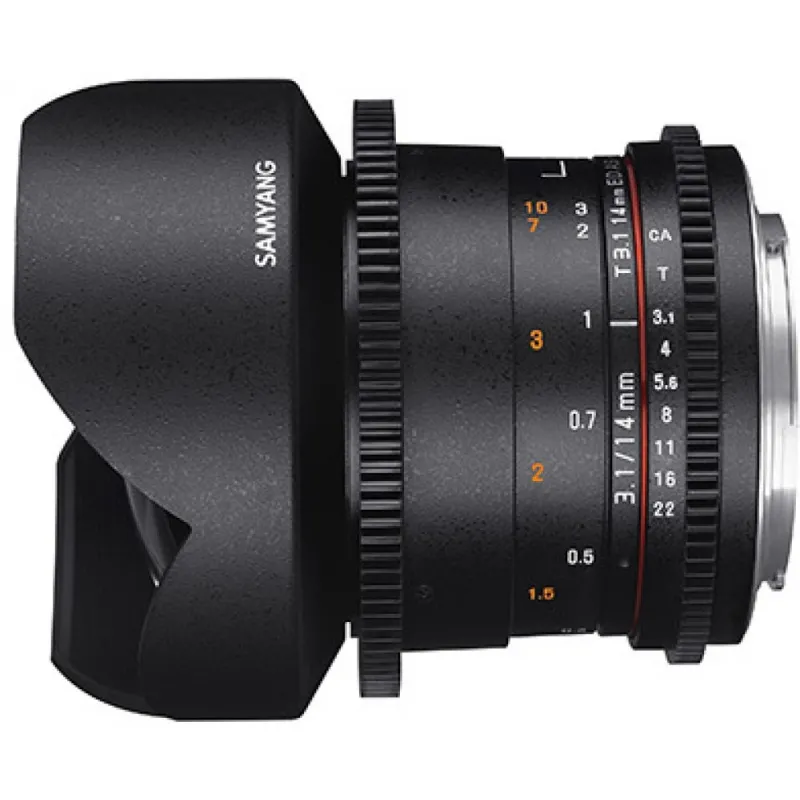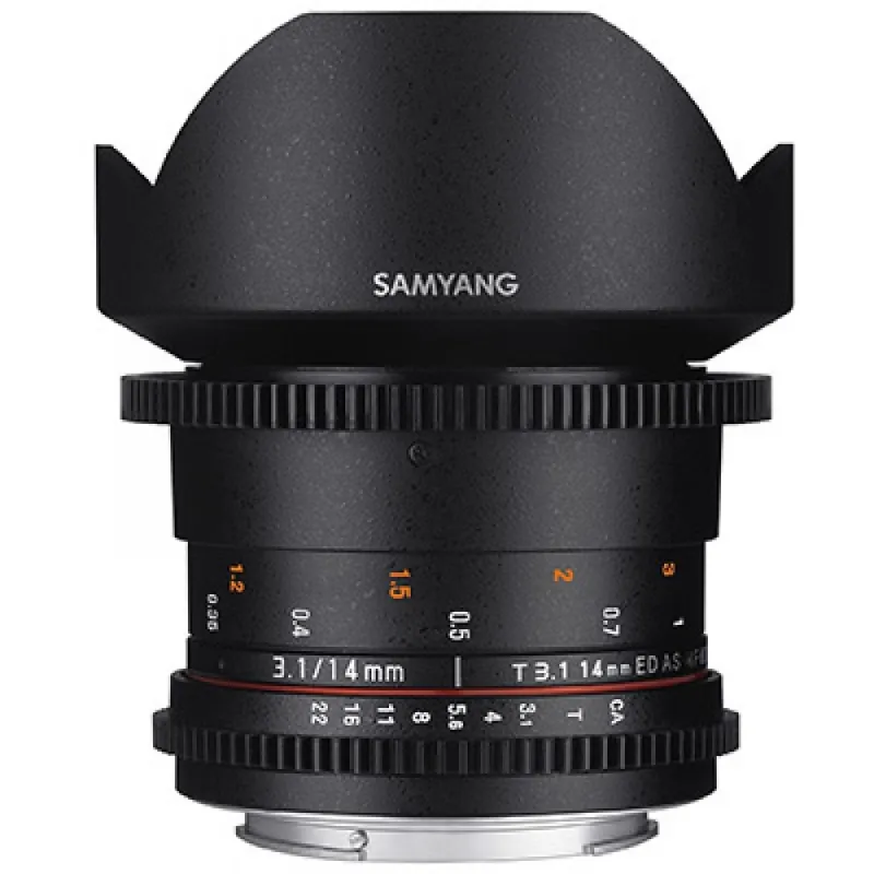 Samyang Optics 14mm T3.1 VDSLR ED AS IF UMC II is a wide angle manual focus cine lens designed for full frame sensor sizes.