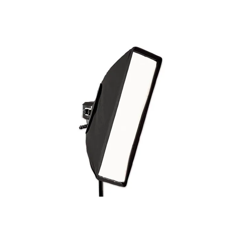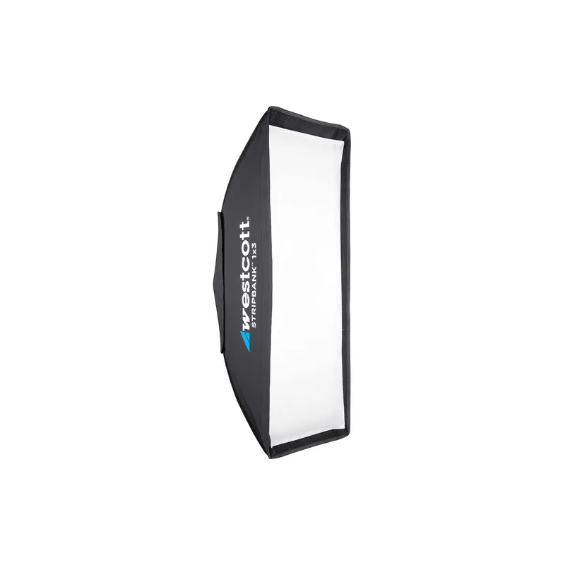 The Westcott Pro 12" x 36" Strip Bank is a softbox that is ideal for use as an accent light or hair light due to its narrow profile. Useful for portrait and product photography. The softbox can be positioned vertically or horizontally and takes up little space. From centre to edge, the loss of light is less than half a stop when using the second fabric with the silver side. Removing the cloth on the inside creates more of a hot spot.
