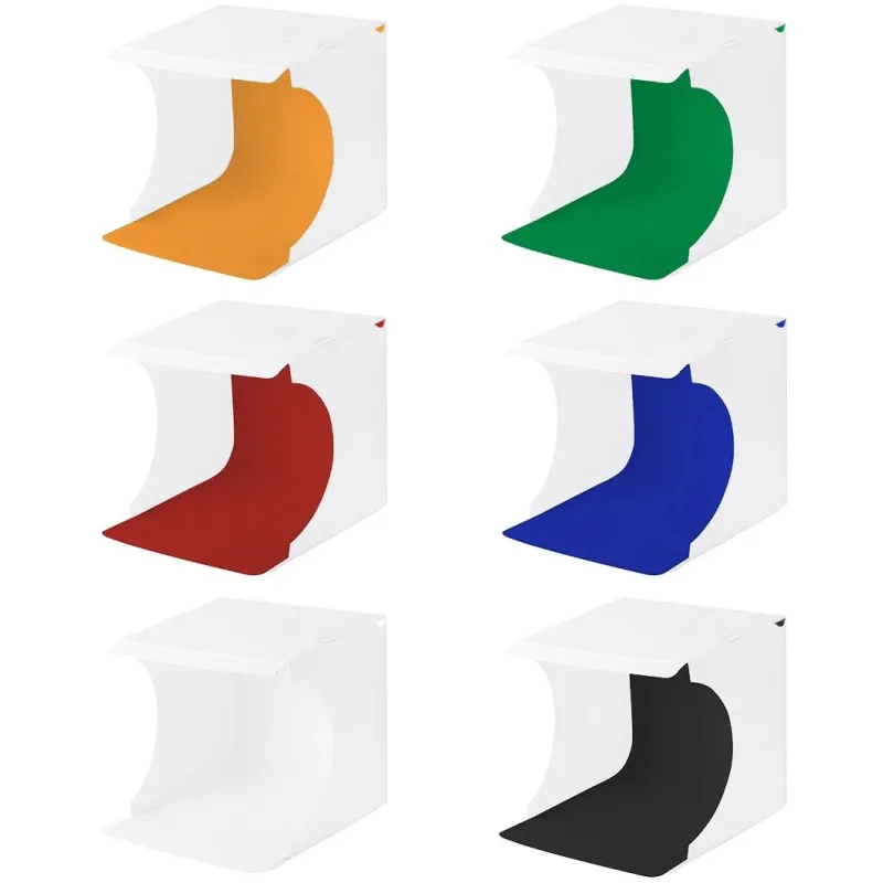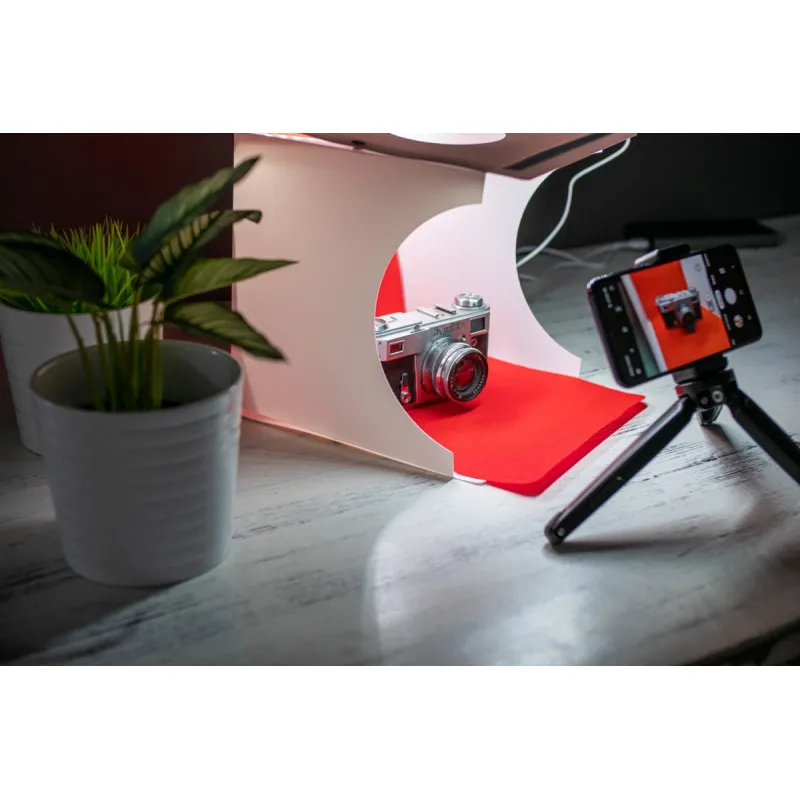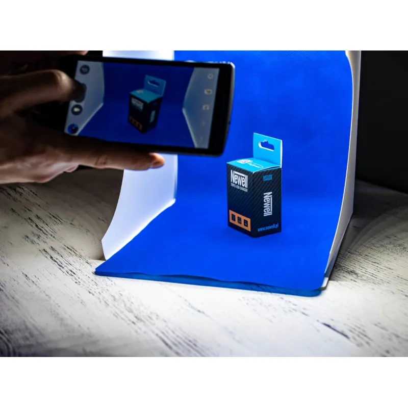 The Newell shadow-less tent is a great tool for product photography. It has been designed with the mobility in mind and is perfect for photographing smaller objects. The set of backgrounds and LED lighting included in the set make it possible to start working right out of the package. Compact dimensions High functionality is ensured by a well-thought-out design that allows you to prepare the position in just a few minutes. The production uses the best quality materials, and the matt finish of the walls helps to achieve the desired softness of lighting. Many arrangement options The set contains backgrounds in six colors. This allows for a creative arrangement of the composition depending on the product being photographed. Necessary lighting The tent is equipped with two LED strips, mounted in a way to ensure uniform lighting of the photographed object. Specification Color temperature: 6200 K (+/- 200 K) LEDs: 2 x 20 Power: 2 x 3.5 W Lumen: 1100 LM Power supply: 5 V 1 A (voltage greater than 5 V is not supported) Dimensions: 24 x 23 x 22 cm (after unfolding) Kit contents Shadow-less tent Backgrounds in 6 colors User manual USB cable Case
